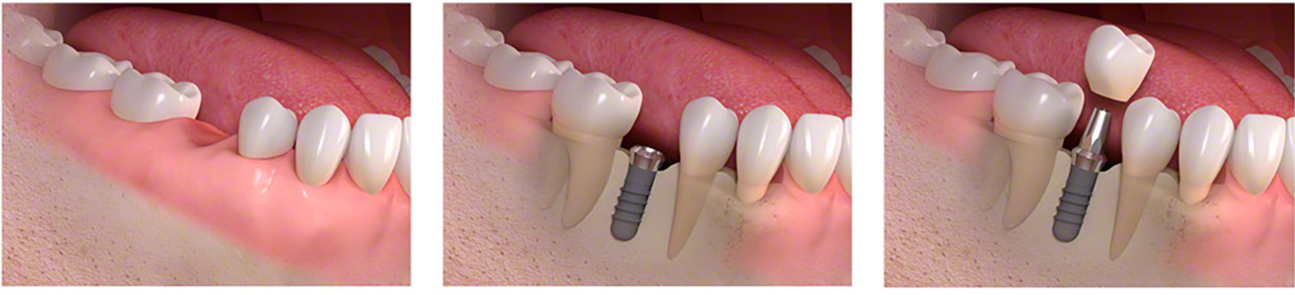 Ein Implantat funktioniert wie eine künstliche Zahnwurzel und bietet eine sichere Basis zur Befestigung von Kronen, Brücken oder Prothesen. Implantatgetragene Zähne sehen aus wie die eigenen. Die neuen Zähne sind in Form und Farbe der Zahnumgebung angepasst.