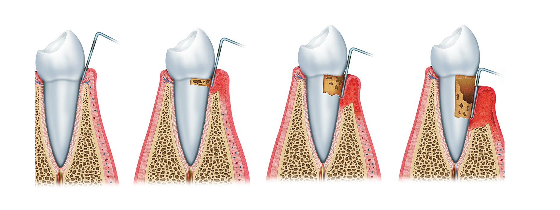Ursache für eine Parodontitis sind Bakterien, die sich zwischen Zahn und Zahnfleisch ansammeln. Werden diese bakteriellen Beläge (Plaque) nicht durch gründliche Reinigung mit Zahnbürste und Zahnseide entfernt, bilden sie einen harten, höckerigen Belag (Zahnstein). Mit der Zeit kommt es zur Rötung, Schwellung und Blutungsneigung des Zahnfleisches. Wird dies nicht behandelt, kann die Entzündung die Fasern, welche die Zähne mit dem Kieferknochen verbinden, zerstören und im weiteren Verlauf zum Knochenabbau führen. Ohne Fasern und Knochen beginnen sich die Zähne zu lockern und gehen möglicherweise verloren.